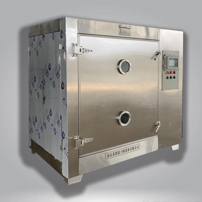 防爆電加熱器將加熱罐內的水升溫至90℃左右,防爆熱水泵將其送到加熱金屬擱板,保持熱水循環(huán),逐步提升密閉烘箱溫度。同時真空系統(tǒng)將烘箱內濕氣體抽出,保持箱內真空度,直至烘箱內物料烘干。